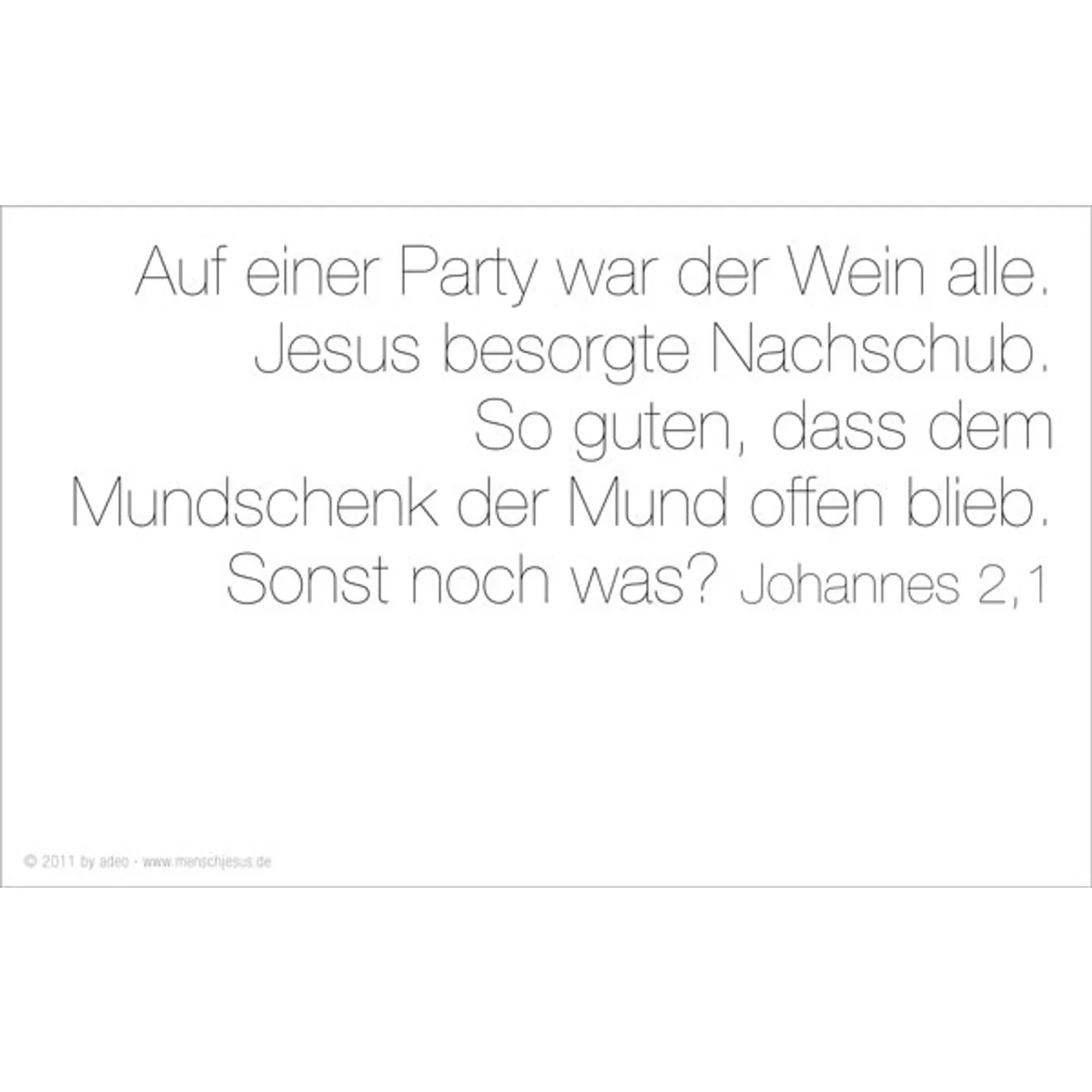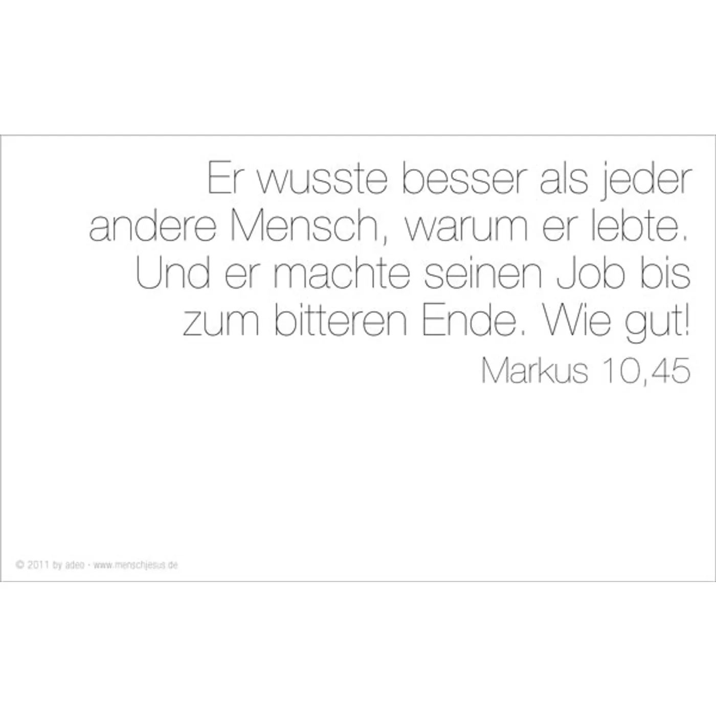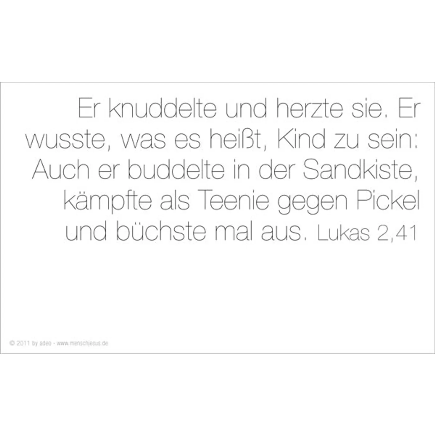 Eva Jung bringt es auf den Punkt. Ungewöhnliche Bilder, starke Texte, die den Blick auf einen ganz besonderen Menschen richten: Jesus. Gottes Sohn und doch ganz Mensch. Klar in seinen Ansagen, liebevoll zu jedem Einzelnen. Die wichtigste Botschaft aller Zeiten in einer Sprache, die jeder versteht, und in Bildern, die unseren Alltag bestimmen.
