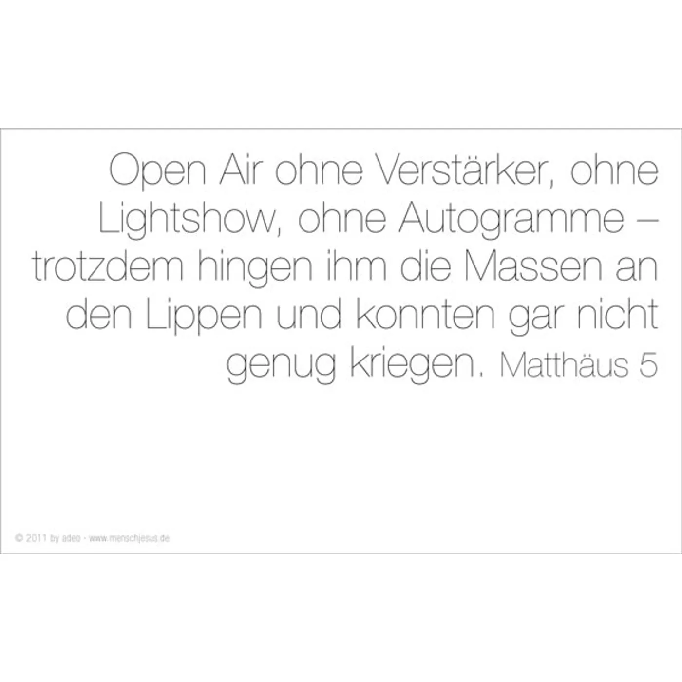 Open Air ohne Verstärker, ohne Lightshow, ohne Autogramme – trotzdem hingen ihm die Massen an den Lippen und konnten gar nicht genug kriegen. Matthäus 5.