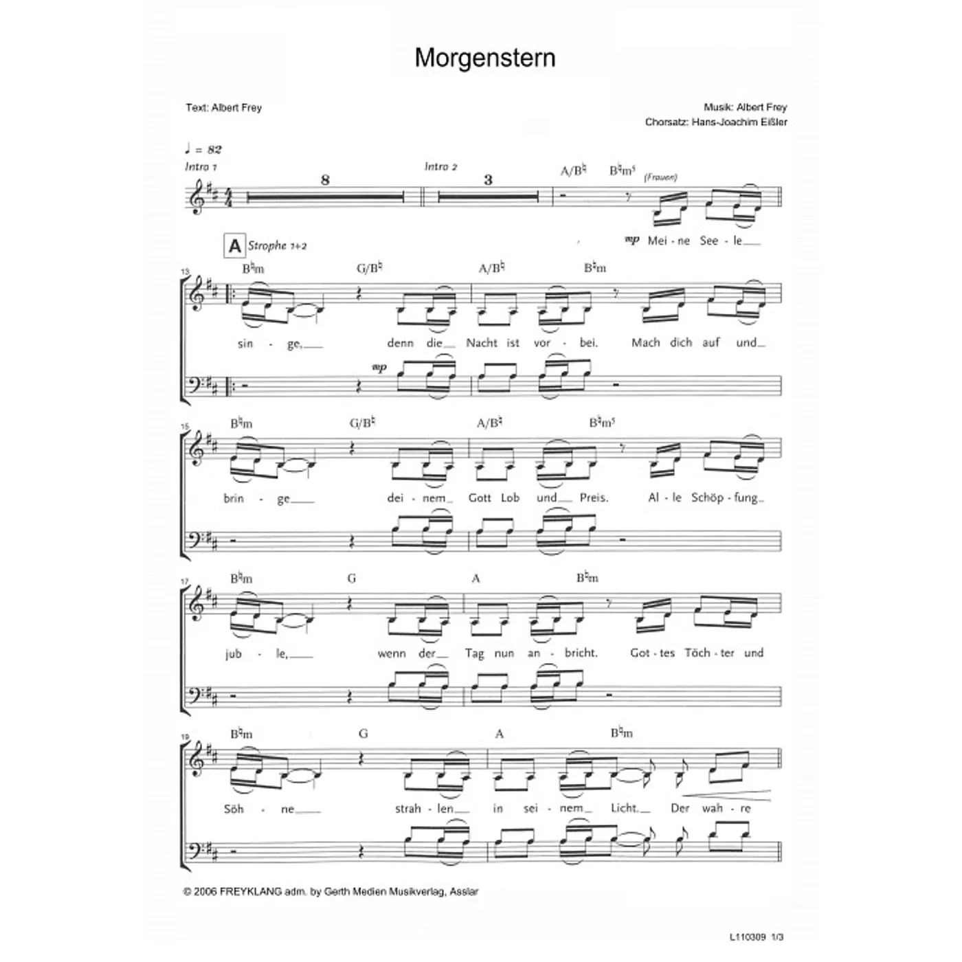 Morgenstern (diese Variante haben Sie gerade ausgewählt) (modern, gemischter Chor, mit Akkorden, vierstimmig, h-Moll) Albert Frey (Komposition, Text), Hans-Joachim Eißler (Chorsatz) |