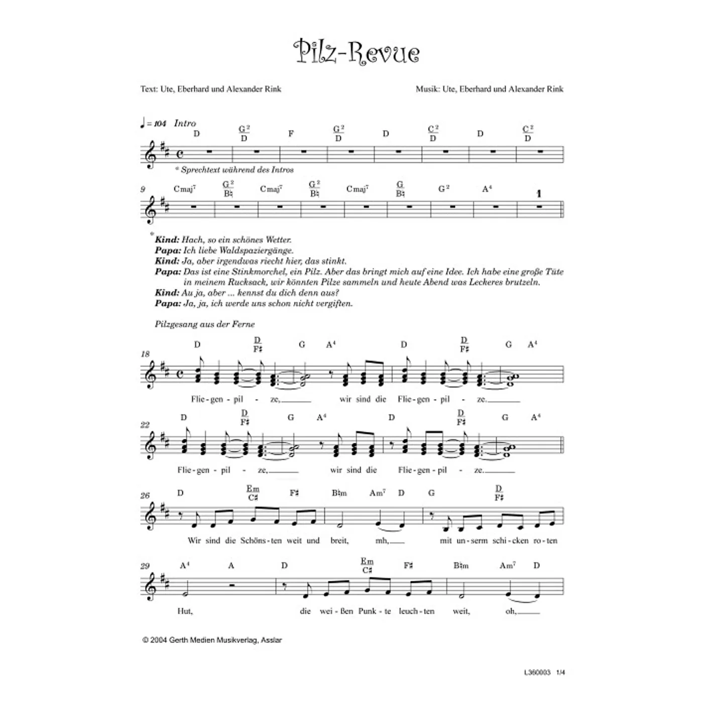Pilz-Revue (diese Variante haben Sie gerade ausgewählt) (Kinderchor, dreistimmig, mit Akkorden, D-Dur) Alexander Rink (Komposition, Text), Eberhard Rink (Komposition, Text), Ute Rink (Komposition, Text) |