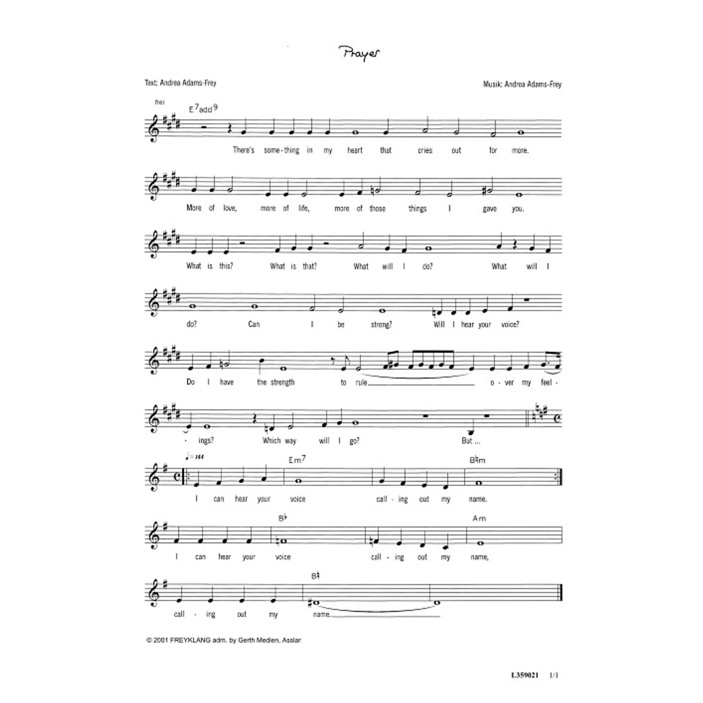 Prayer (diese Variante haben Sie gerade ausgewählt) (einstimmig, mit Akkorden, E-Dur) Andrea Adams-Frey (Komposition, Text) |