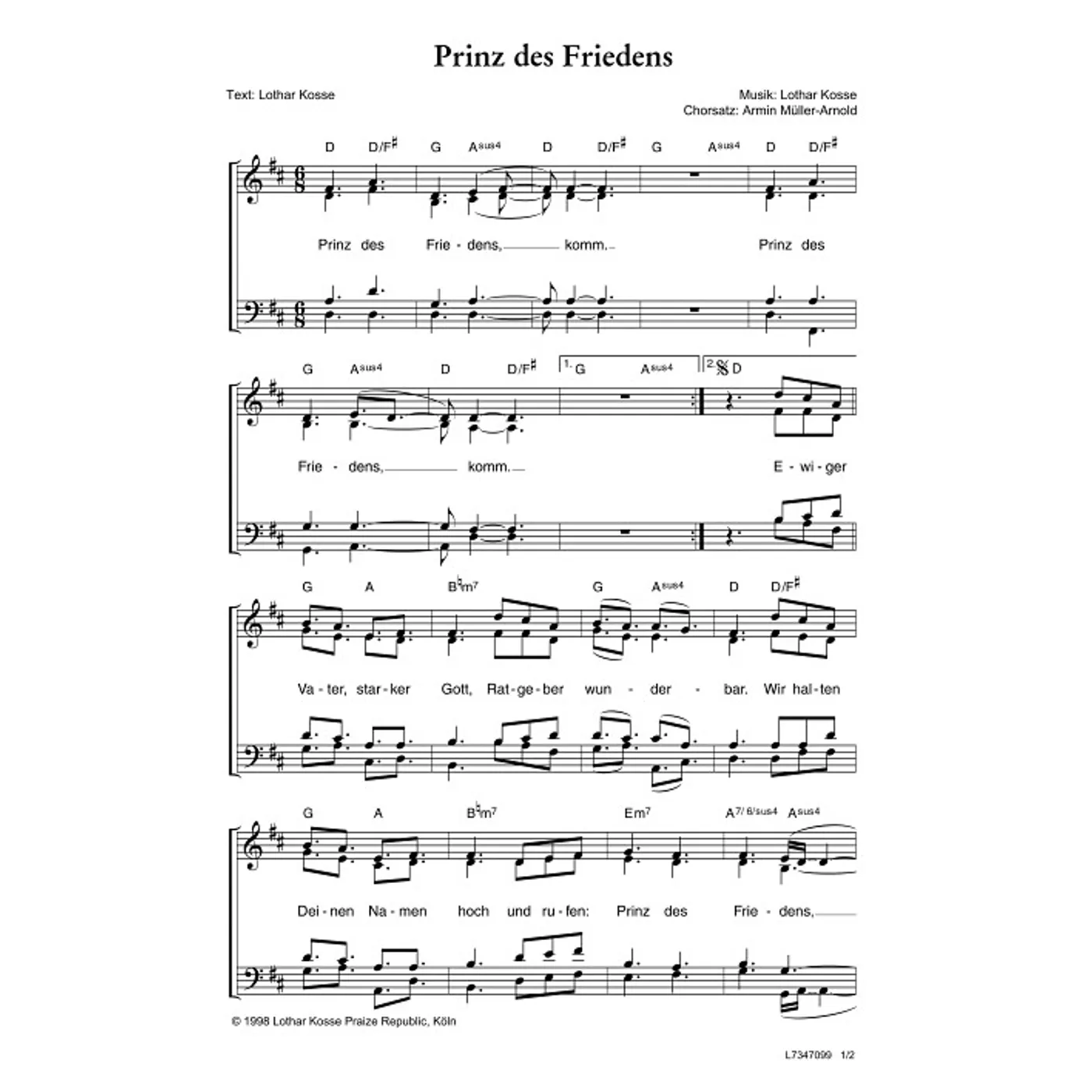 Prinz des Friedens (diese Variante haben Sie gerade ausgewählt) (modern, gemischter Chor, mit Akkorden, vierstimmig, D-Dur) Lothar Kosse (Komposition, Text), Armin Müller-Arnold (Chorsatz) |