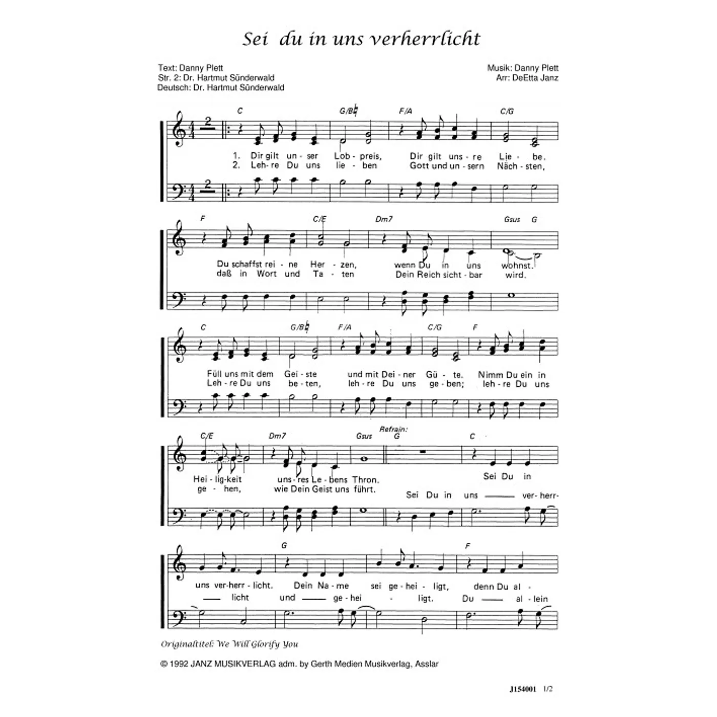 Sei du in uns verherrlicht (diese Variante haben Sie gerade ausgewählt) (modern, gemischter Chor, mit Akkorden, vierstimmig, C-Dur) Danny Plett (Text, Komposition, Chorsatz), DeEtta Janz (Chorsatz), Hartmut Sünderwald (Übersetzung) |