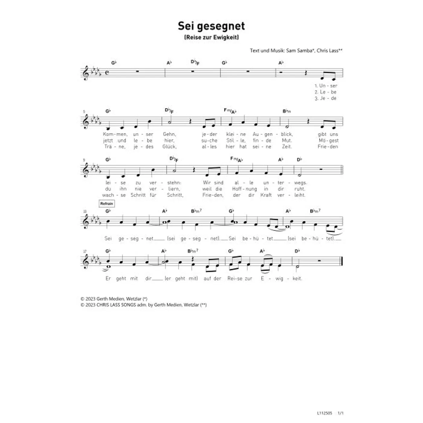 Sei gesegnet (Reise zur Ewigkeit) (diese Variante haben Sie gerade ausgewählt) (einstimmig, mit Akkorden, Ges-Dur) Chris Lass (Komposition, Text), Sam Samba (Komposition, Text) |