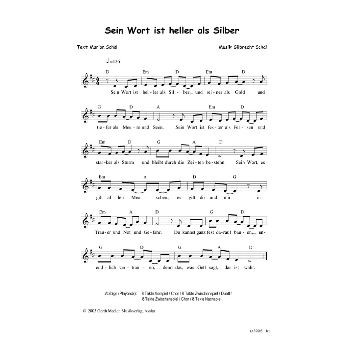 Sein Wort ist heller als Silber (diese Variante haben Sie gerade ausgewählt) (einstimmig, mit Akkorden, D-Dur) Gilbrecht Schäl (Komposition), Marion Schäl (Text) |