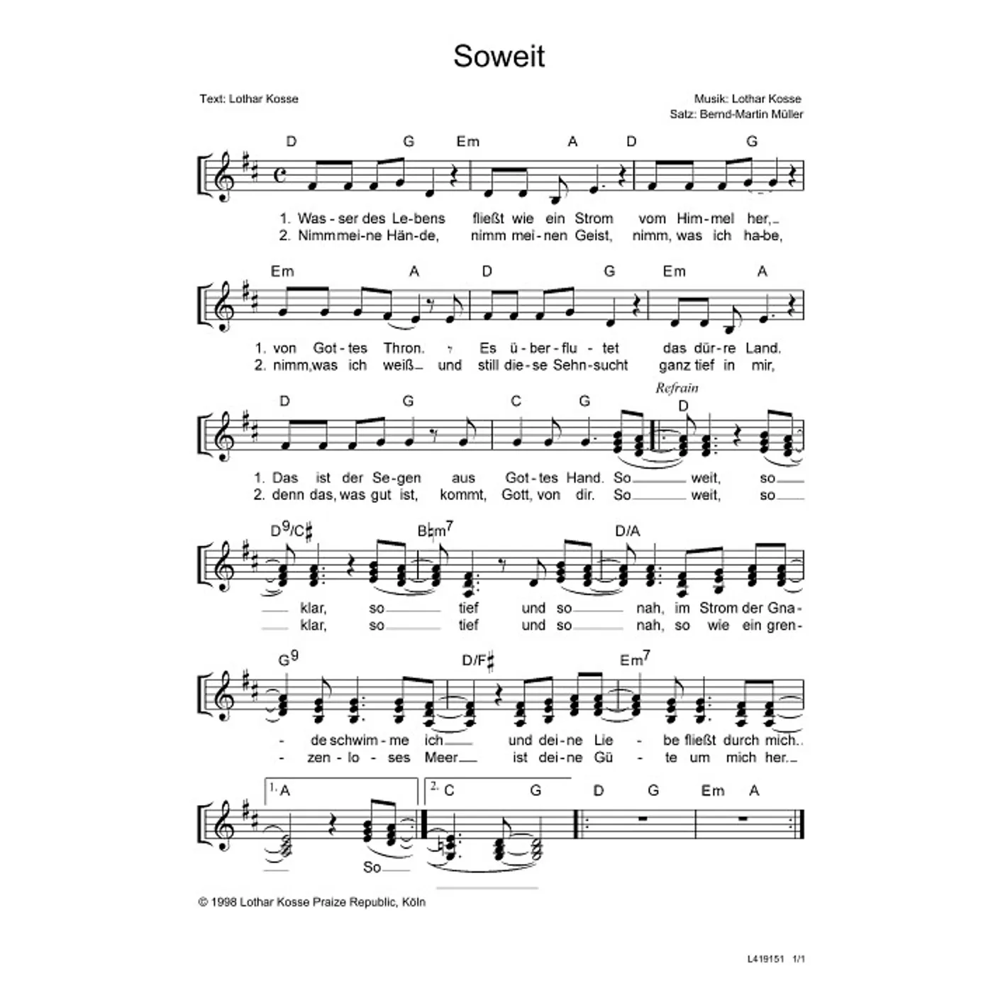 So weit (modern, einstimmig, mit Akkorden, D-Dur) Lothar Kosse (Komposition, Text) | modern, einstimmig, mit Akkorden, D-Dur | 1,50 € |