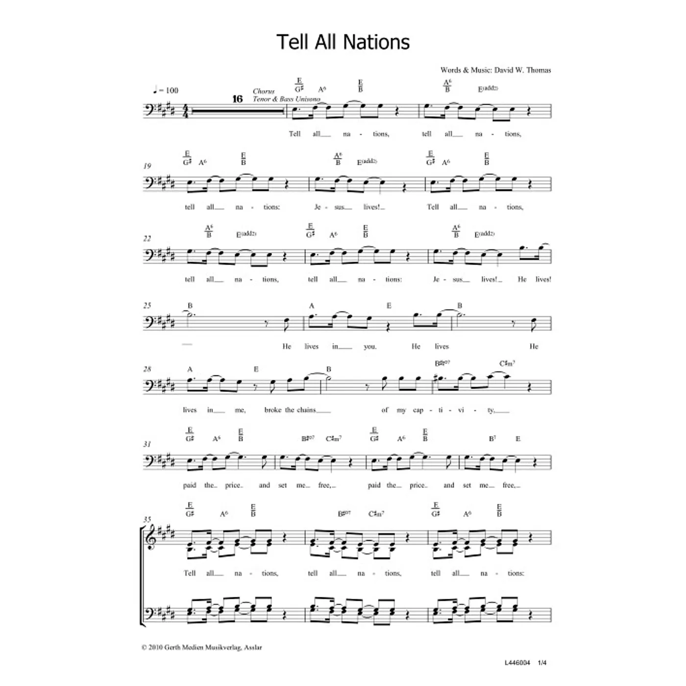 Tell All Nations (diese Variante haben Sie gerade ausgewählt) (modern, Solostimme, gemischter Chor, mit Akkorden, vierstimmig, E-Dur) Hanjo Gäbler (Bearbeiter), David W. Thomas (Komposition, Text) |