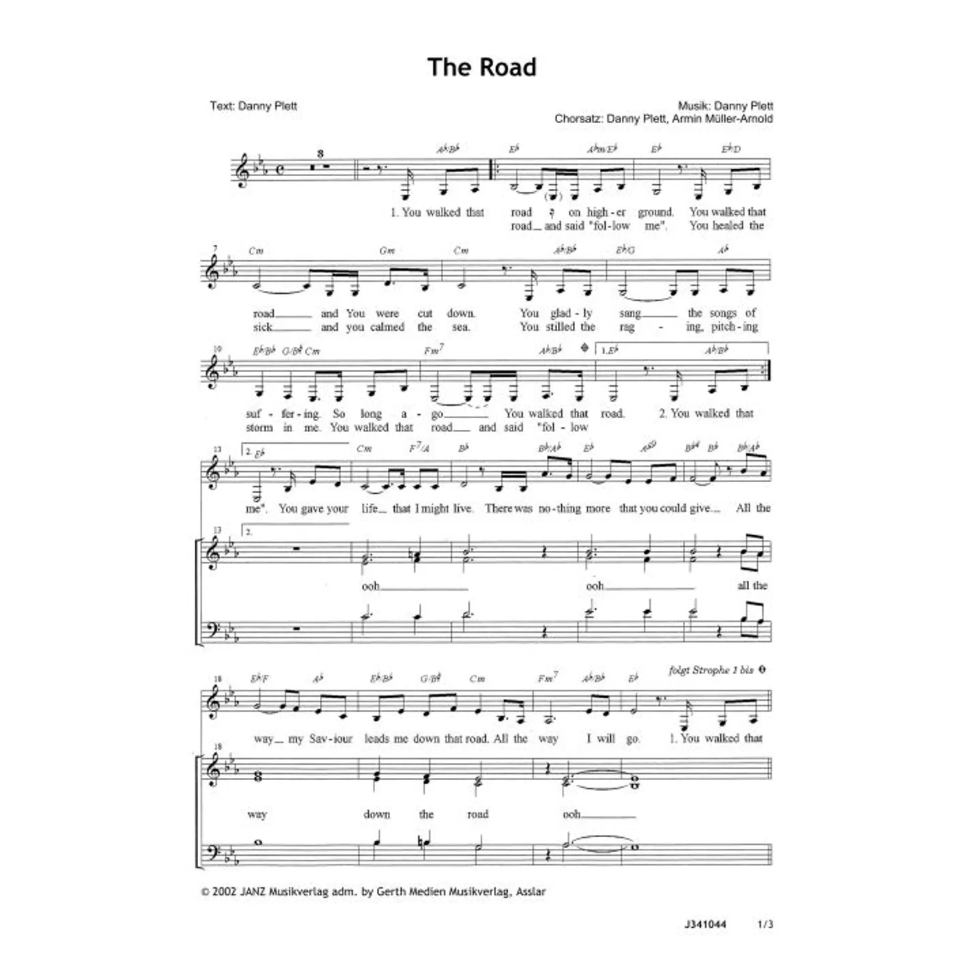 The Road (diese Variante haben Sie gerade ausgewählt) (modern, Backings, Solostimme, gemischter Chor, mit Akkorden, vierstimmig, Es-Dur) Armin Müller-Arnold (Chorsatz), Danny Plett (Komposition, Text, Chorsatz) |