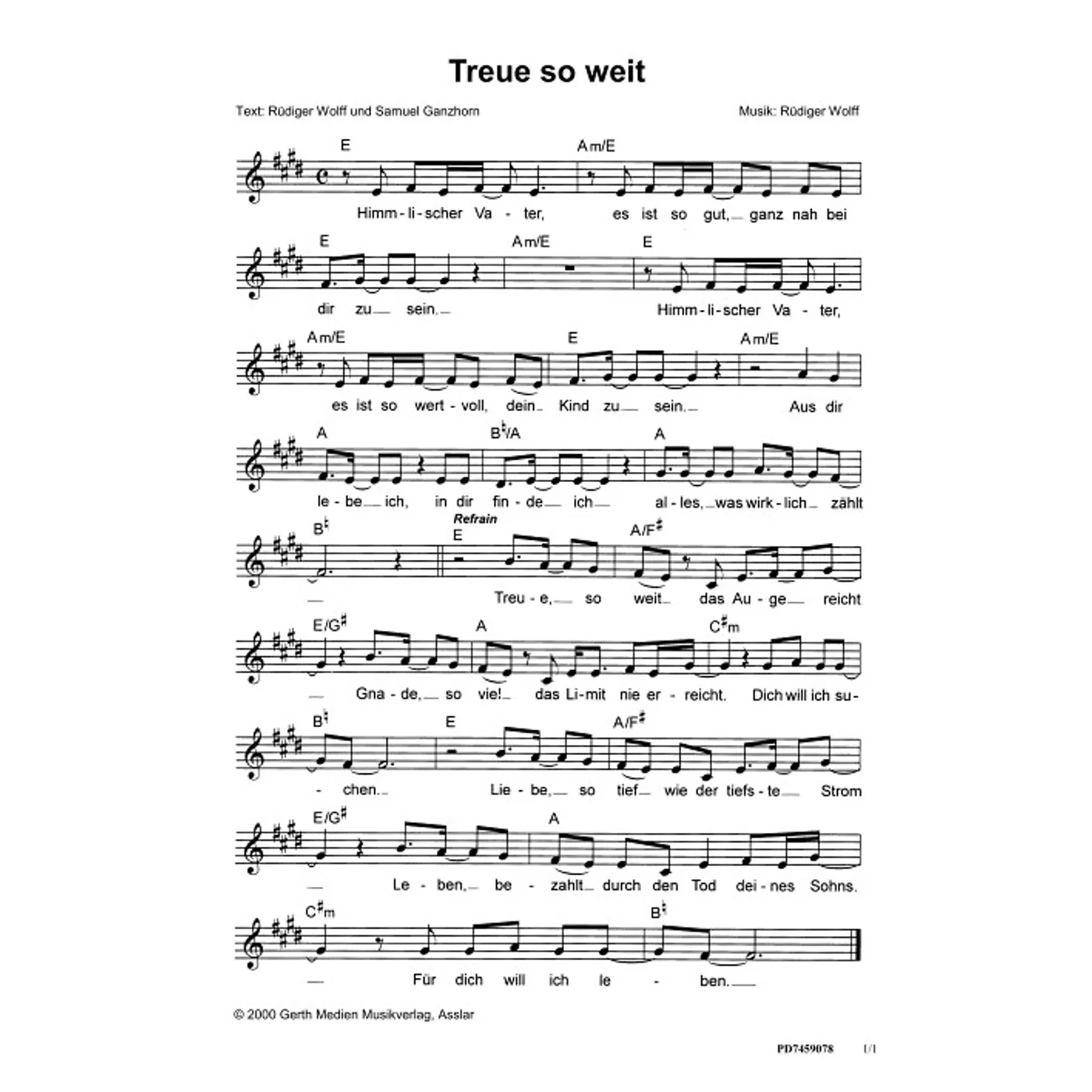Treue so weit (diese Variante haben Sie gerade ausgewählt) (einstimmig, mit Akkorden, E-Dur) Rüdiger Wolff (Komposition, Text), Samuel Ganzhorn (Text) |