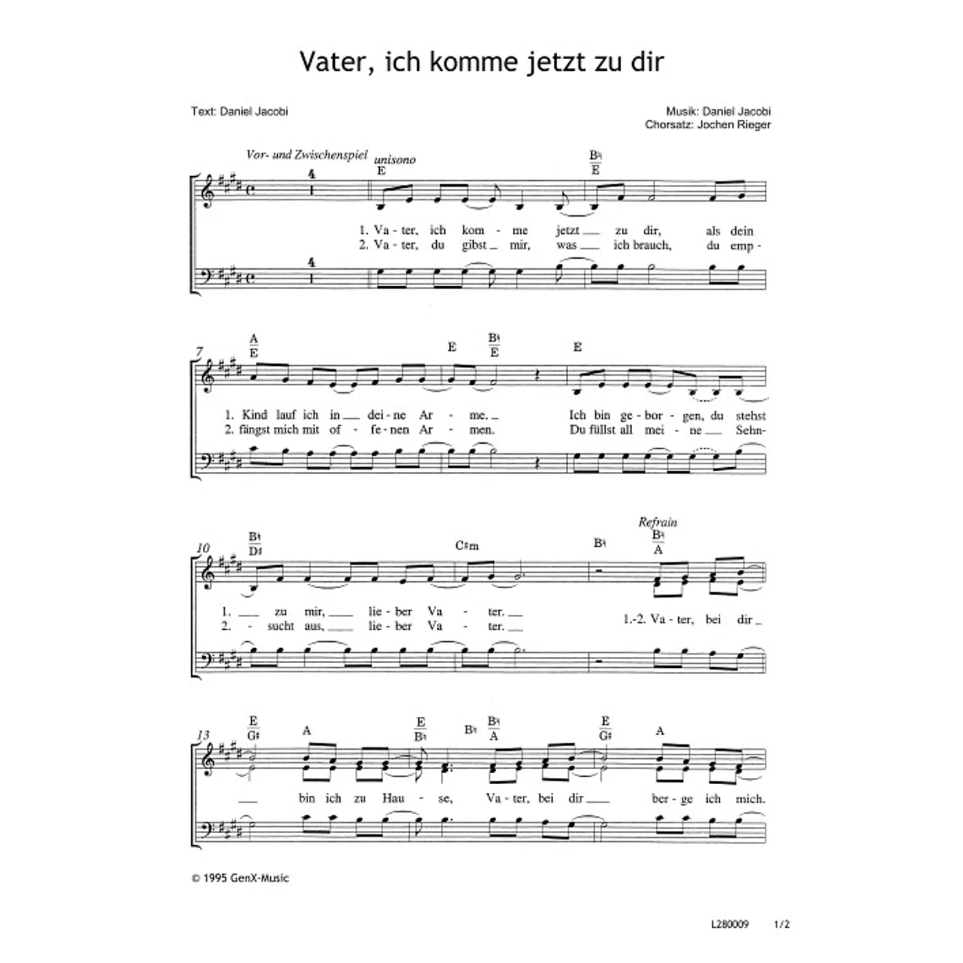 Vater, ich komme jetzt zu dir (diese Variante haben Sie gerade ausgewählt) (modern, dreistimmig, gemischter Chor, mit Akkorden, E-Dur) Daniel Jacobi (Komposition, Text), Jochen Rieger (Bearbeiter) |