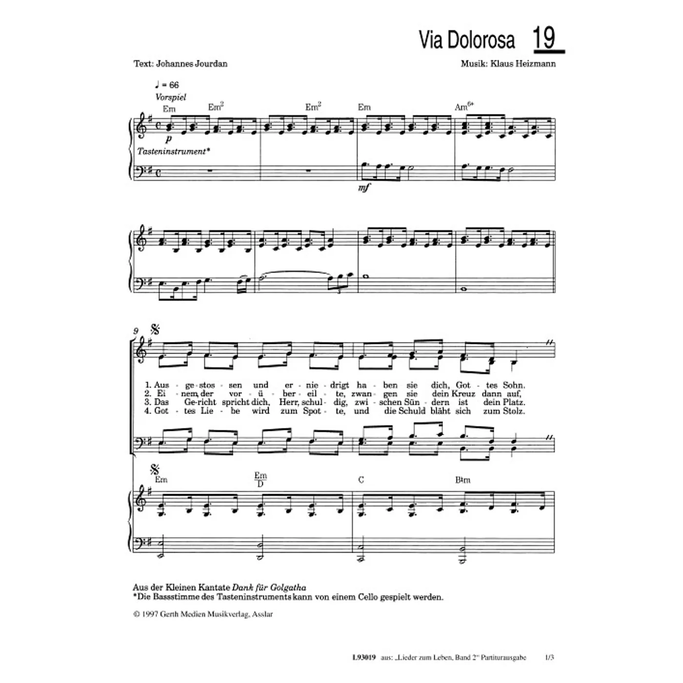 Via Dolorosa (traditionell, gemischter Chor, mit Akkorden, vierstimmig, E-Moll, gleiche Reihe) Klaus Heizmann (Komposition), Johannes Jourdan (Text) | traditionell, gemischter Chor, mit Akkorden, vierstimmig, E-Moll, gleiche Reihe | 1,50 € | ||