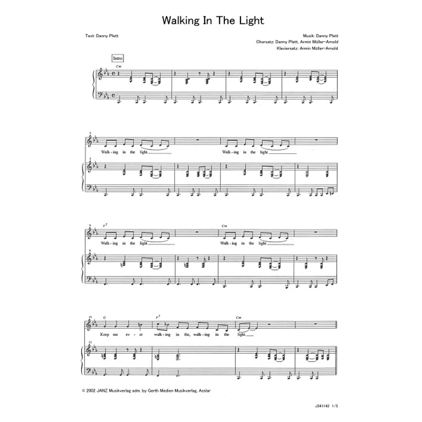 Walking In The Light (diese Variante haben Sie gerade ausgewählt) (modern, Klavier, gemischter Chor, mit Akkorden, vierstimmig, C-Moll) Danny Plett (Komposition, Text, Chorsatz), Armin Müller-Arnold (Klaviersatz) |