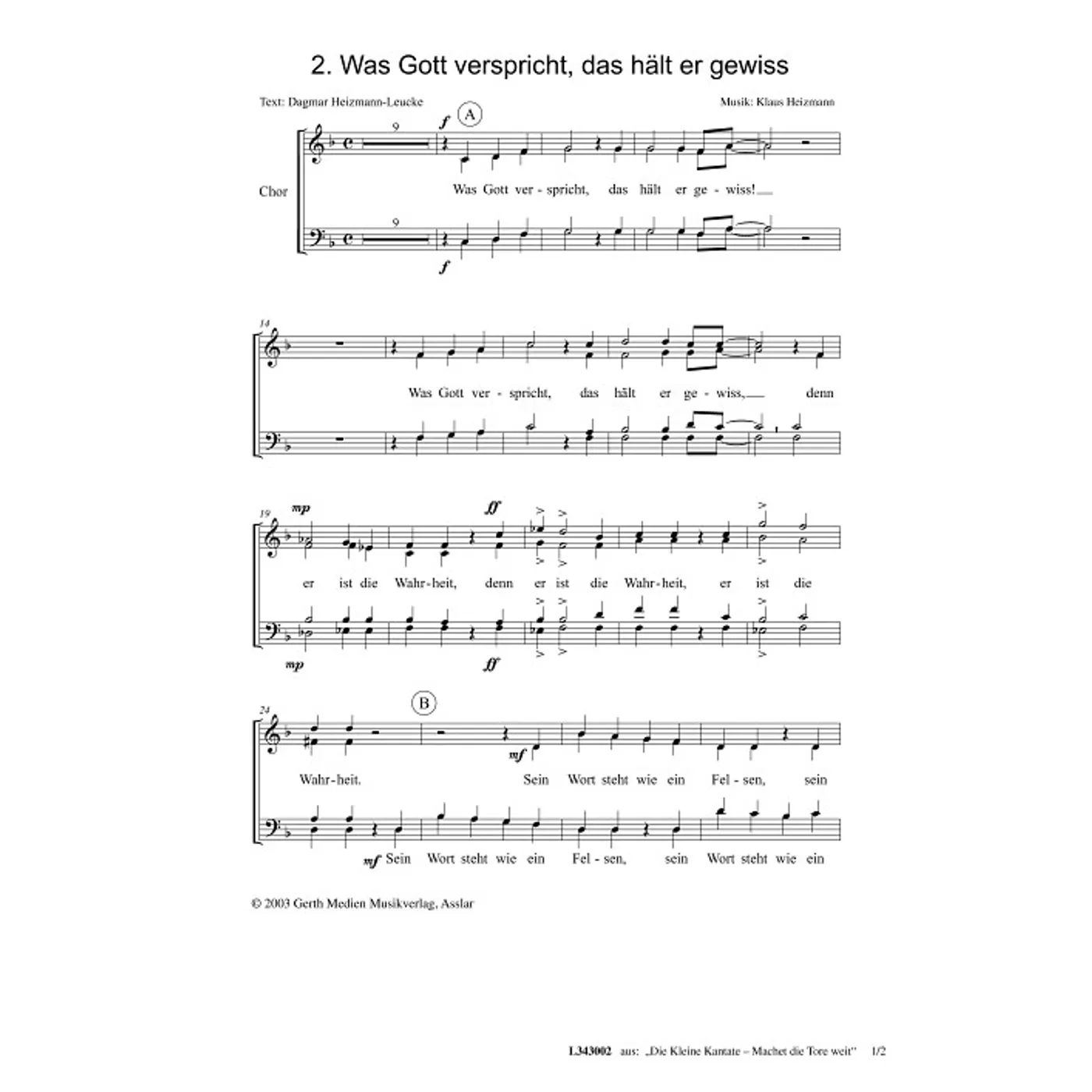 Was Gott verspricht, das hält er gewiss (diese Variante haben Sie gerade ausgewählt) (Kantate, gemischter Chor, vierstimmig) Klaus Heizmann (Komposition, Chorsatz), Dagmar Heizmann-Leucke (Text) |