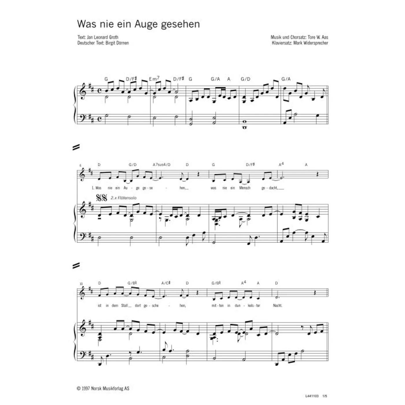 Was nie ein Auge gesehen (modern, Solostimme, gemischter Chor, mit Akkorden, vierstimmig, D-Dur) Tore W. Aas (Komposition, Chorsatz), Jan Leonard Groth (Text), Birgit Dörnen (Übersetzung) | modern, Solostimme, gemischter Chor, mit Akkorden, vierstimmig, D-Dur | 2,00 € |