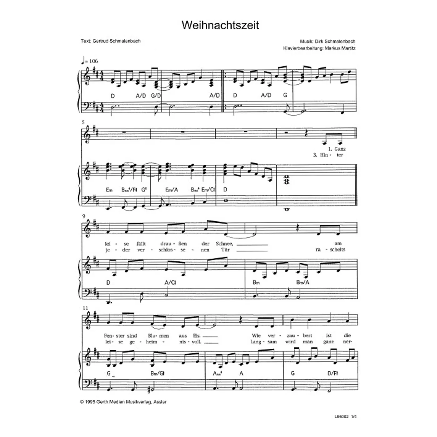 Weihnachtszeit (einstimmig, mit Akkorden, D-Dur) Dirk Schmalenbach (Komposition), Gertrud Schmalenbach (Text) | einstimmig, mit Akkorden, D-Dur | 1,50 € |