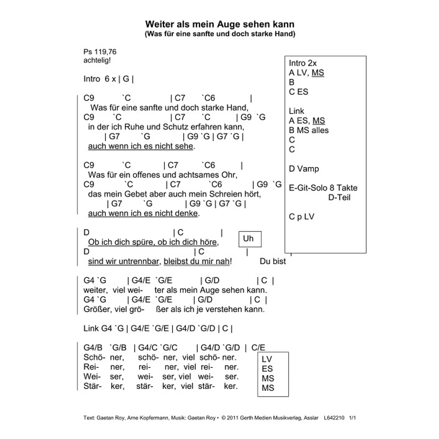 Weiter als mein Auge sehen kann (Leadsheet) (diese Variante haben Sie gerade ausgewählt) (modern, mit Akkorden, C-Dur) Gaetan Roy (Komposition, Text), Arne Kopfermann (Text) |