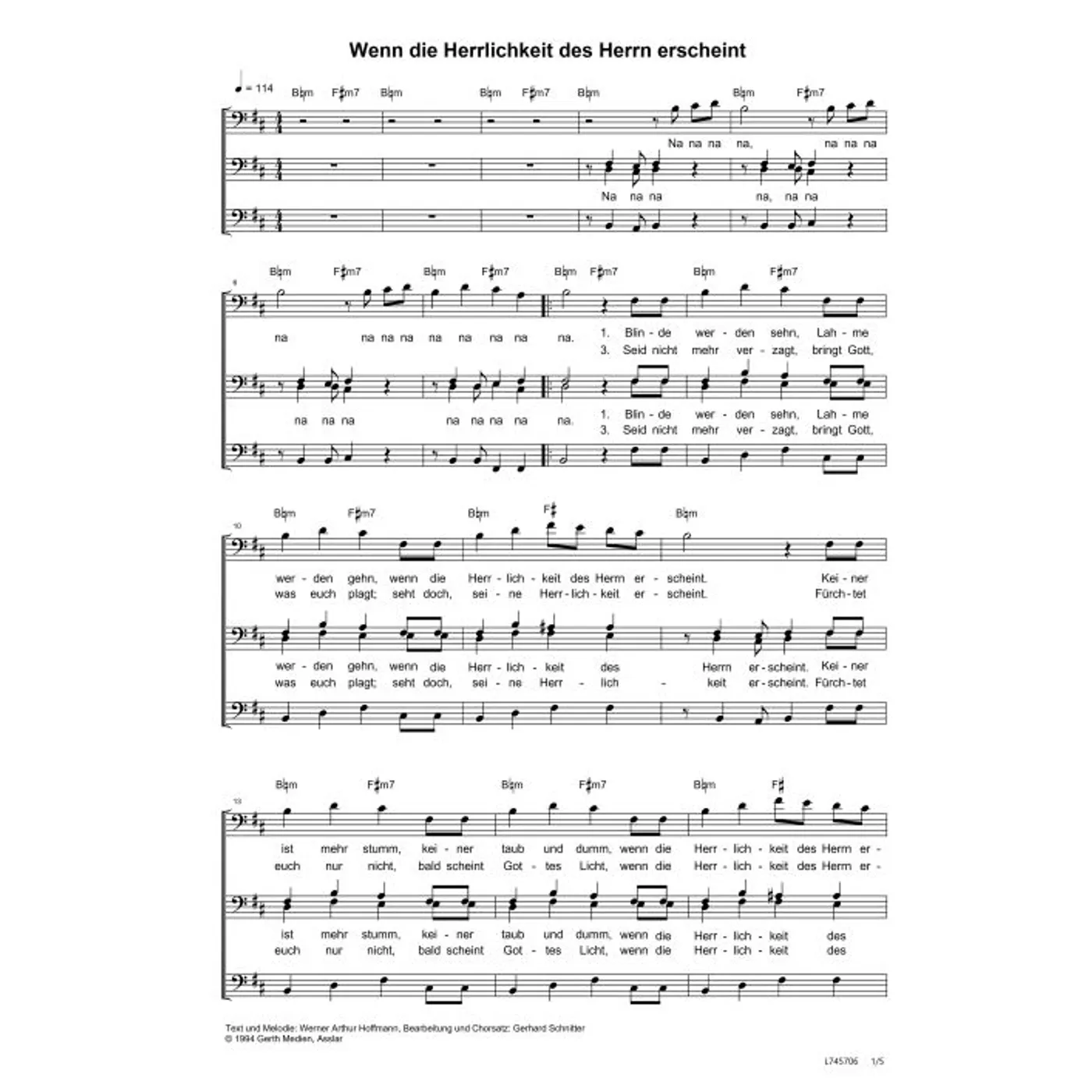 Wenn die Herrlichkeit des Herrn erscheint (diese Variante haben Sie gerade ausgewählt) (modern, Männerchor, mit Akkorden, vierstimmig, h-Moll) Werner A. Hoffmann (Komposition, Text), Gerhard Schnitter (Chorsatz) |