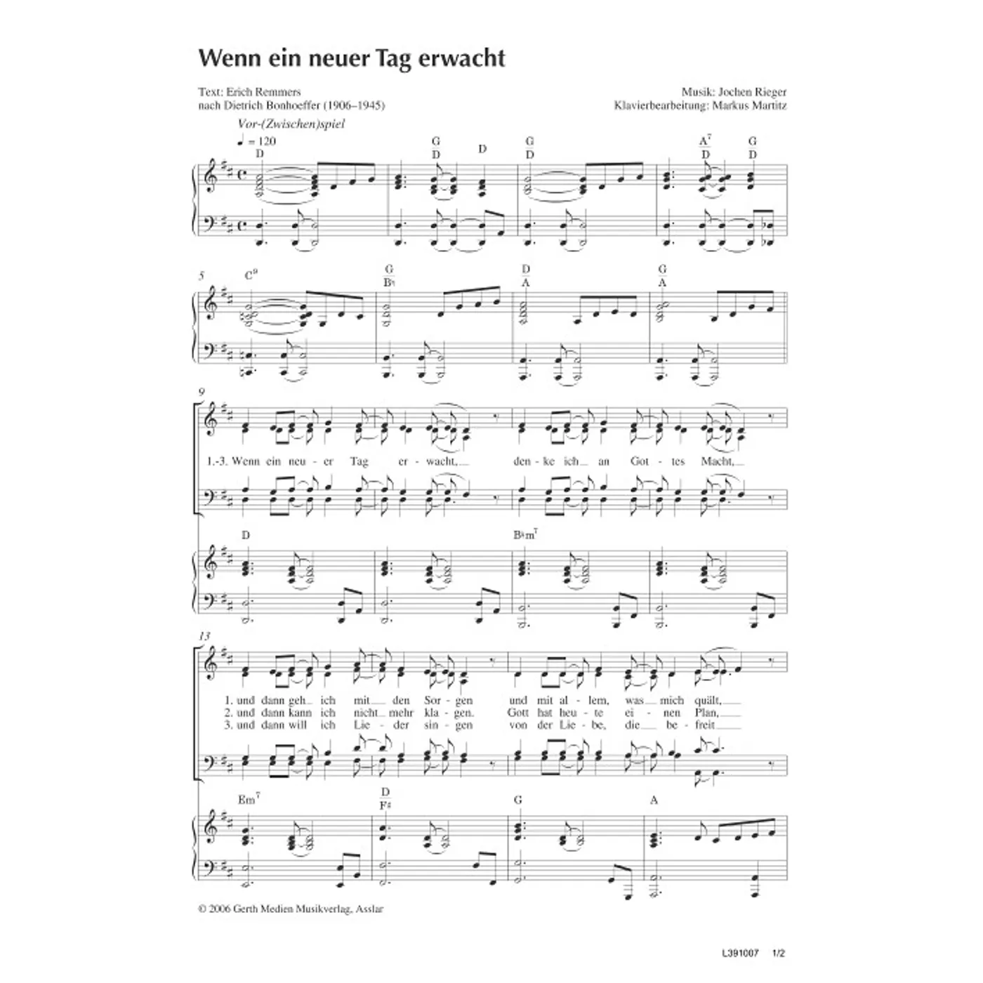 Wenn ein neuer Tag erwacht (modern, gemischter Chor, mit Akkorden, vierstimmig, D-Dur) Erich Remmers (Text), Jochen Rieger (Komposition, Bearbeiter) | modern, gemischter Chor, mit Akkorden, vierstimmig, D-Dur | 1,50 € |