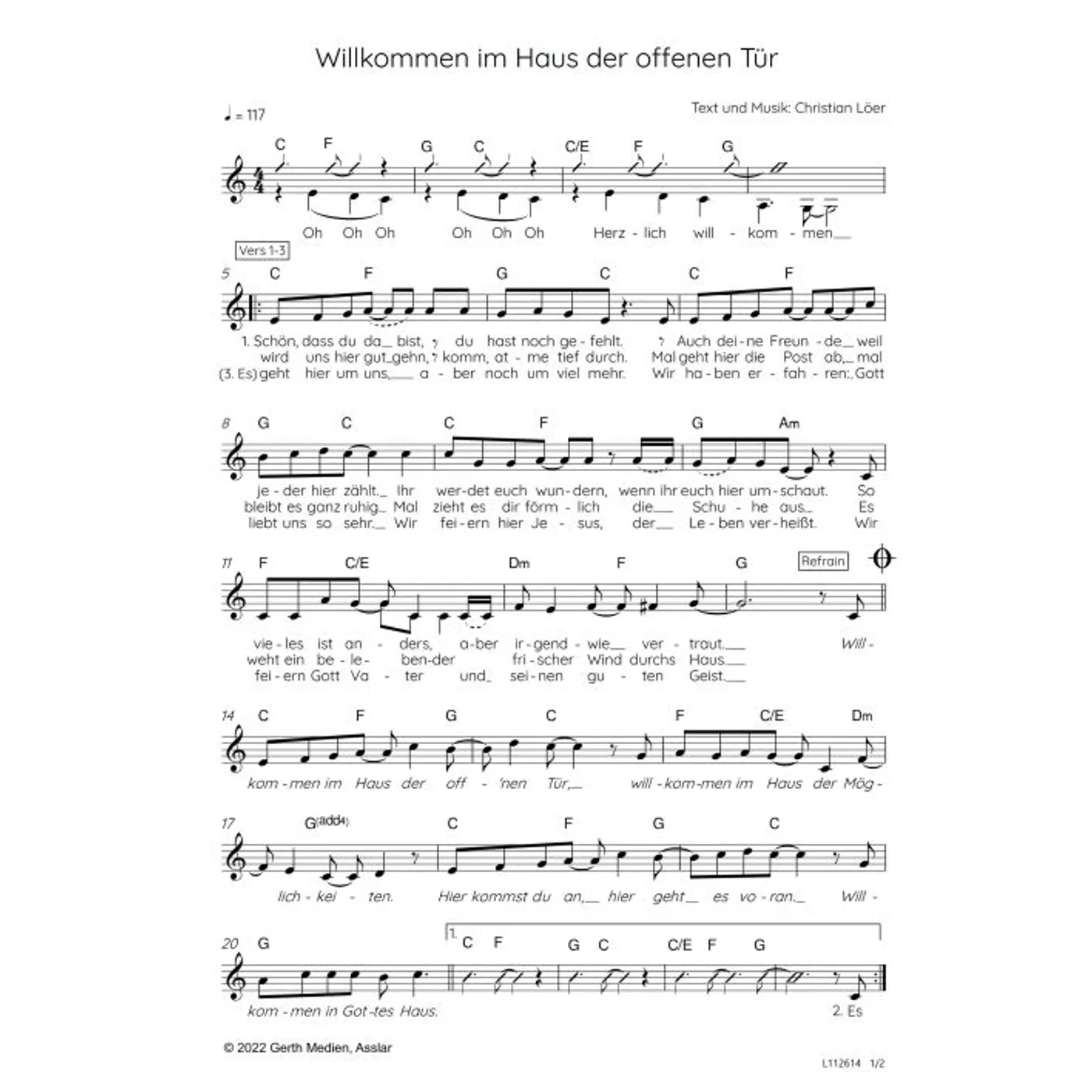 Willkommen im Haus der offnen Tür (diese Variante haben Sie gerade ausgewählt) (modern, einstimmig, mit Akkorden, C-Dur) Christian Löer (Text, Komposition) |