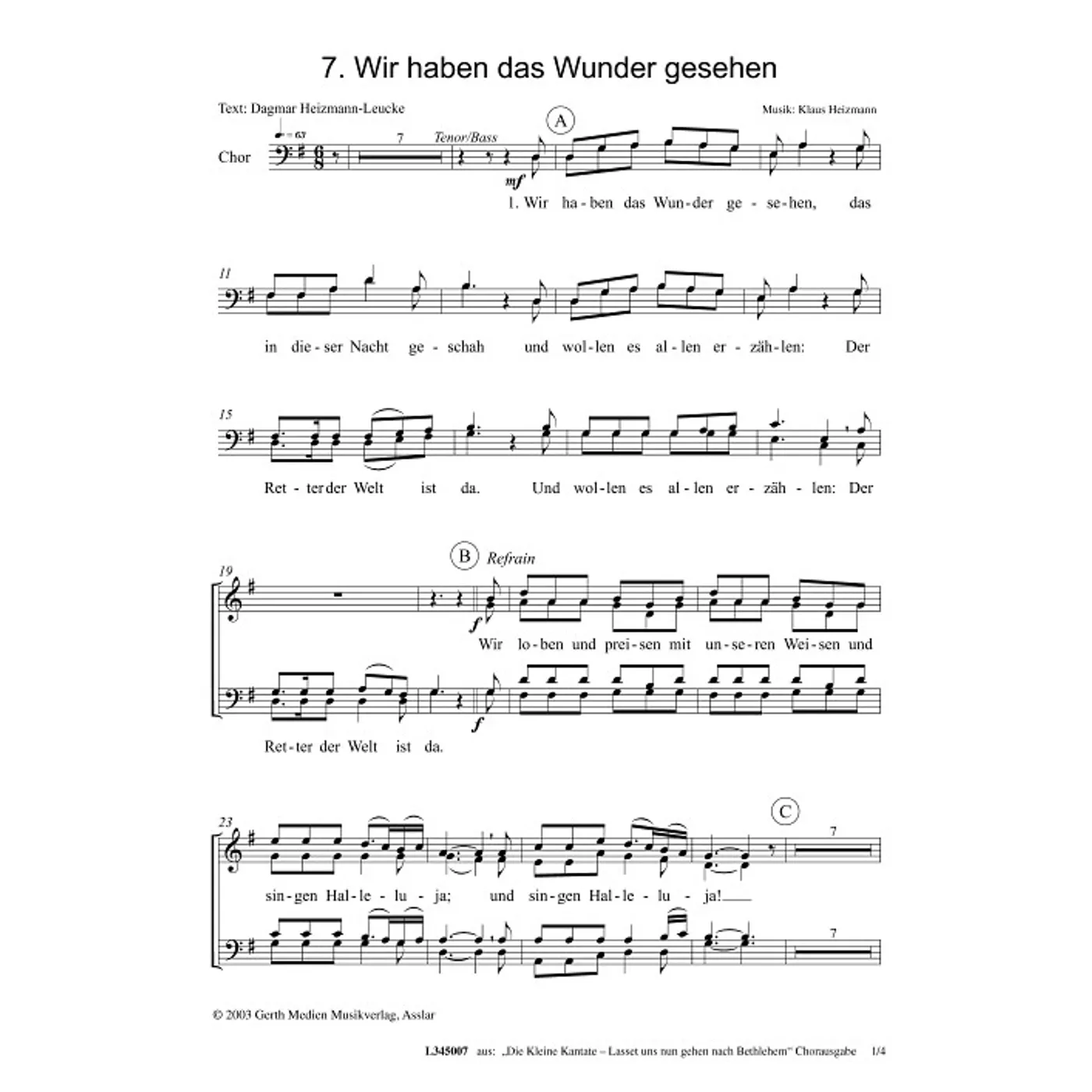 Wir haben das Wunder gesehen (diese Variante haben Sie gerade ausgewählt) (Kantate, Kinderchor, gemischter Chor, vierstimmig) Dagmar Heizmann-Leucke (Text), Klaus Heizmann (Komposition) |